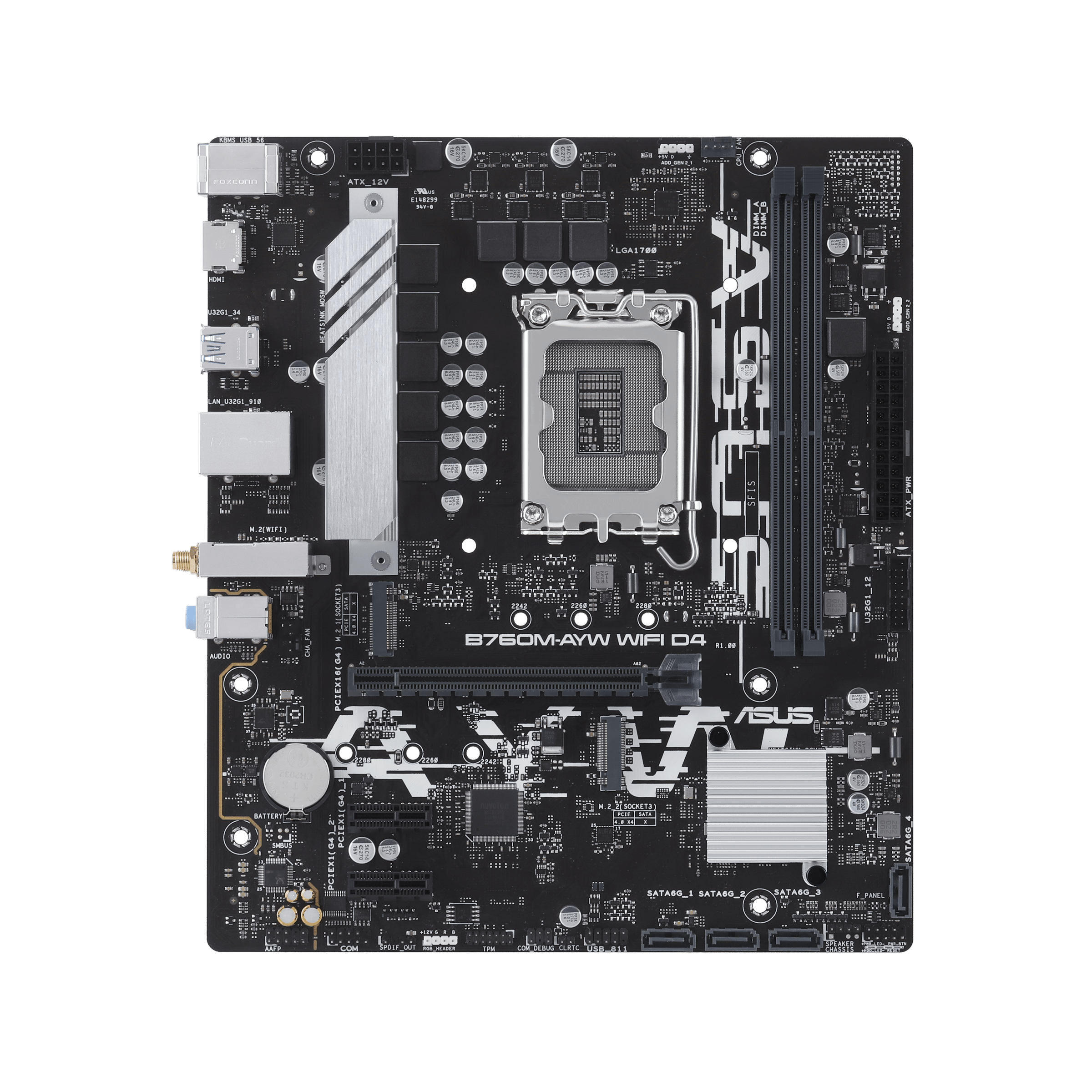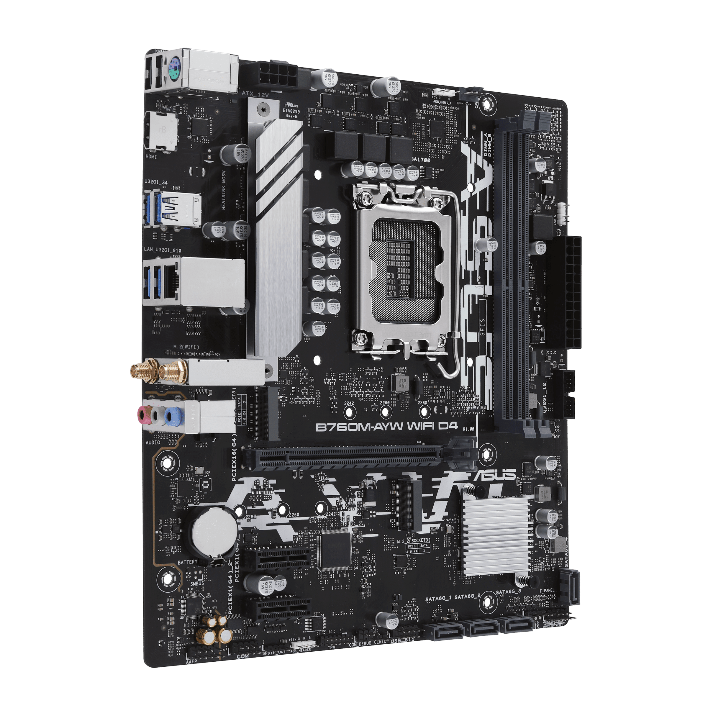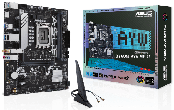 ASUS B760M-AYW WIFI D4, an Intel® B760 LGA 1700 mATX motherboard with PCIe 4.0, two PCIe 4.0 M.2 slots, DDR4, Realtek 2.5Gb Ethernet, WiFi 6, HDMI®, SATA 6 Gbps, front USB 3.2 Gen 1, Aura Sync