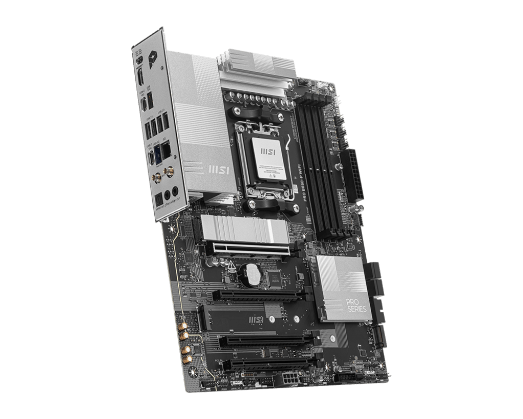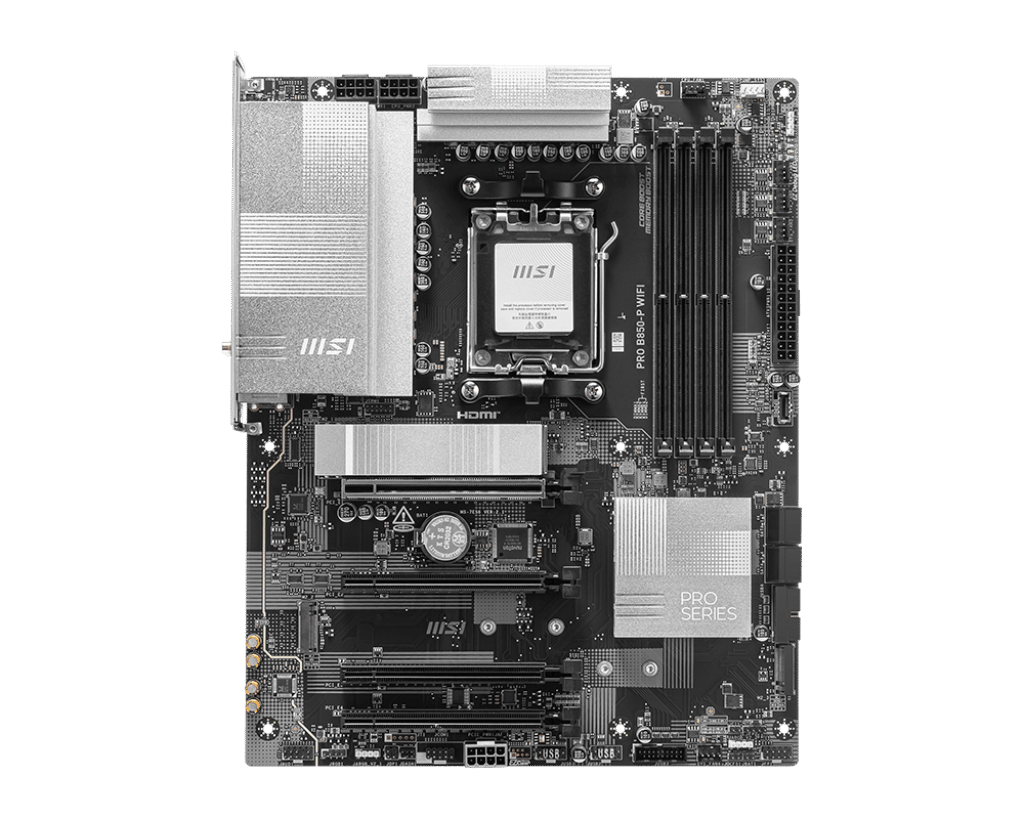 PRO B850-P WIFI offers a simple design with a harmonious silver color scheme that perfectly matches both white and black PC builds. It is engineered with many exclusive features of MSI, a true Wi-Fi 7 with EZ Antenna, 5G LAN, PCIe 5.0 M.2 with EZ M.2 Shield Frozr II, and Supplemental PCIe Power, ready for the AMD Ryzen™ 9000 series processors.