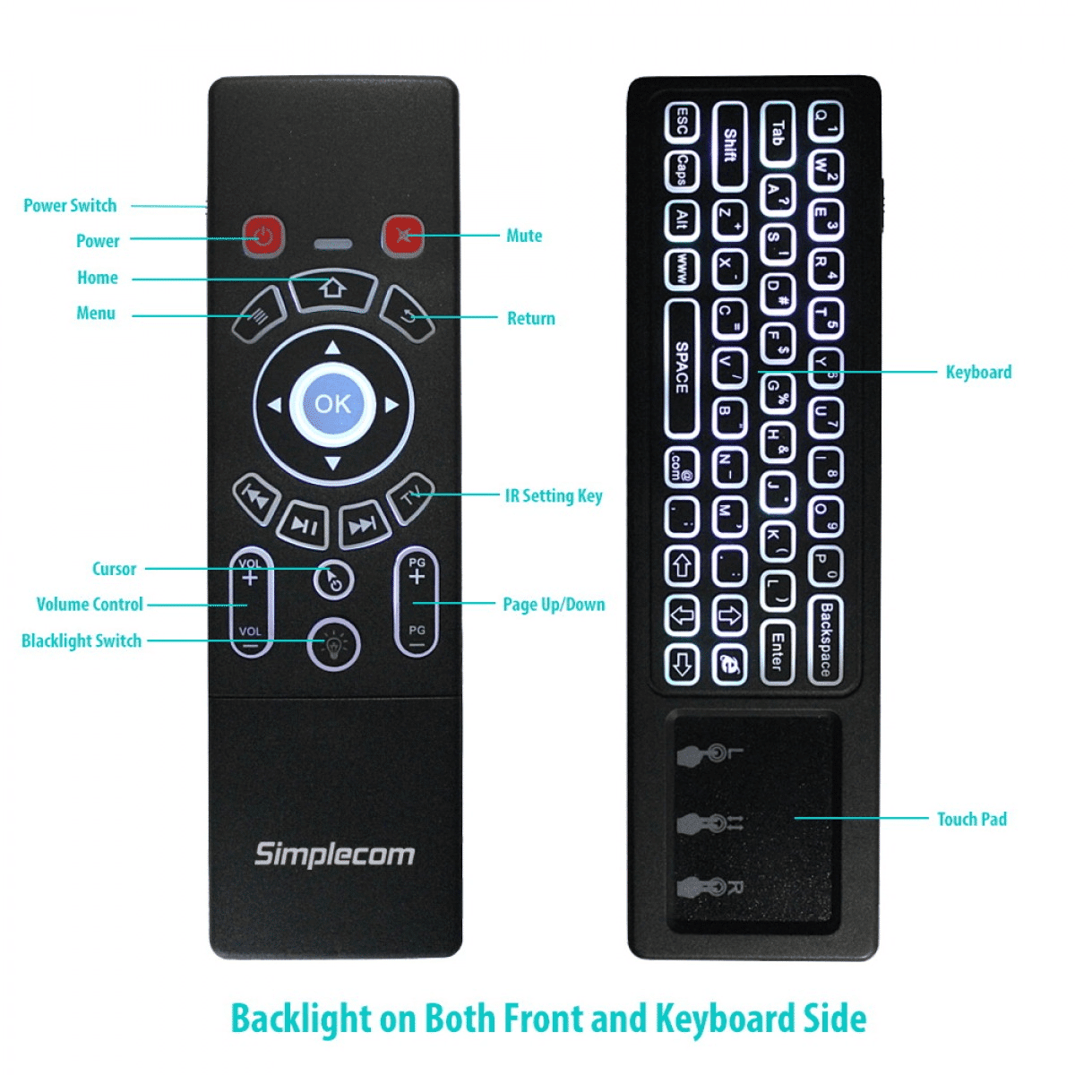 Simplecom RT250 2.4GHz Wireless Remote/Air Mouse/Keyboard with TouchPad and Backlight